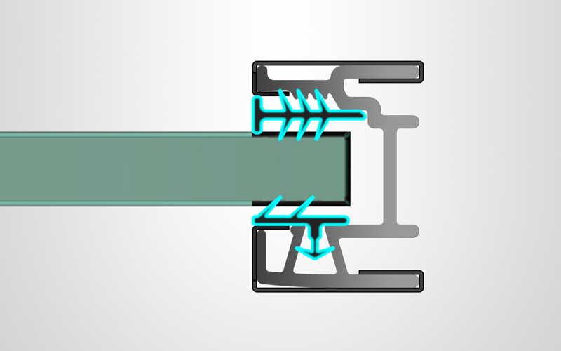 采用獨創的反刺膠條,可以使玻璃牢牢固定于僅 2 公分左右的側材內,牢鎖