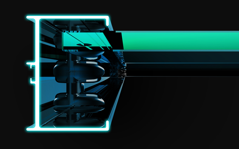 采用 U 型軌道結合不銹鋼全封閉式軸承滑輪,軌道兩點均衡受力,滑行不虛晃,且設置防跳件,不正常推拉亦無懼脫軌,全方位保障安全。